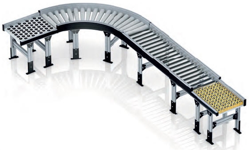 根據(jù)實(shí)際空間位置,滾筒輸送線設(shè)計(jì)了一個(gè)90°的彎道滾筒輸送線結(jié)構(gòu)。而對(duì)于彎道滾筒輸送線的動(dòng)力驅(qū)動(dòng),決定應(yīng)用將電機(jī)和減速器共同置于輥筒體內(nèi)部的新型驅(qū)動(dòng)裝置——電動(dòng)滾筒。為了形成滾筒彎道,設(shè)計(jì)時(shí)采用錐形電動(dòng)滾筒。